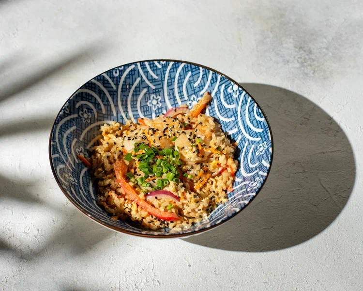 Куриное филе, рис, болгарский перец, морковь, лук красный, зеленый лук, сливочный соус, кунжут.(350гр.)
