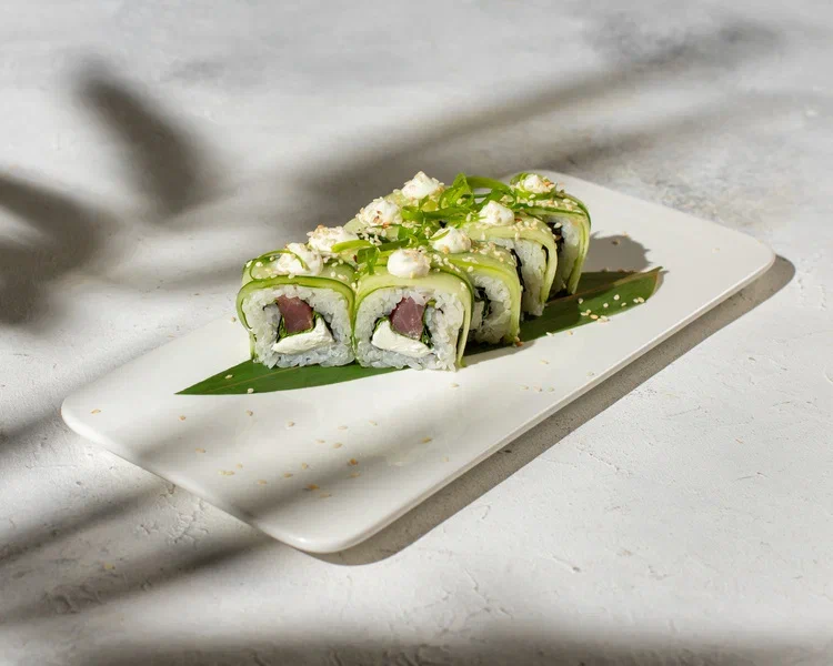 Тунец, огурец, сливочный сыр, листья салата, соус сливочное яблоко, кунжут. 8 шт